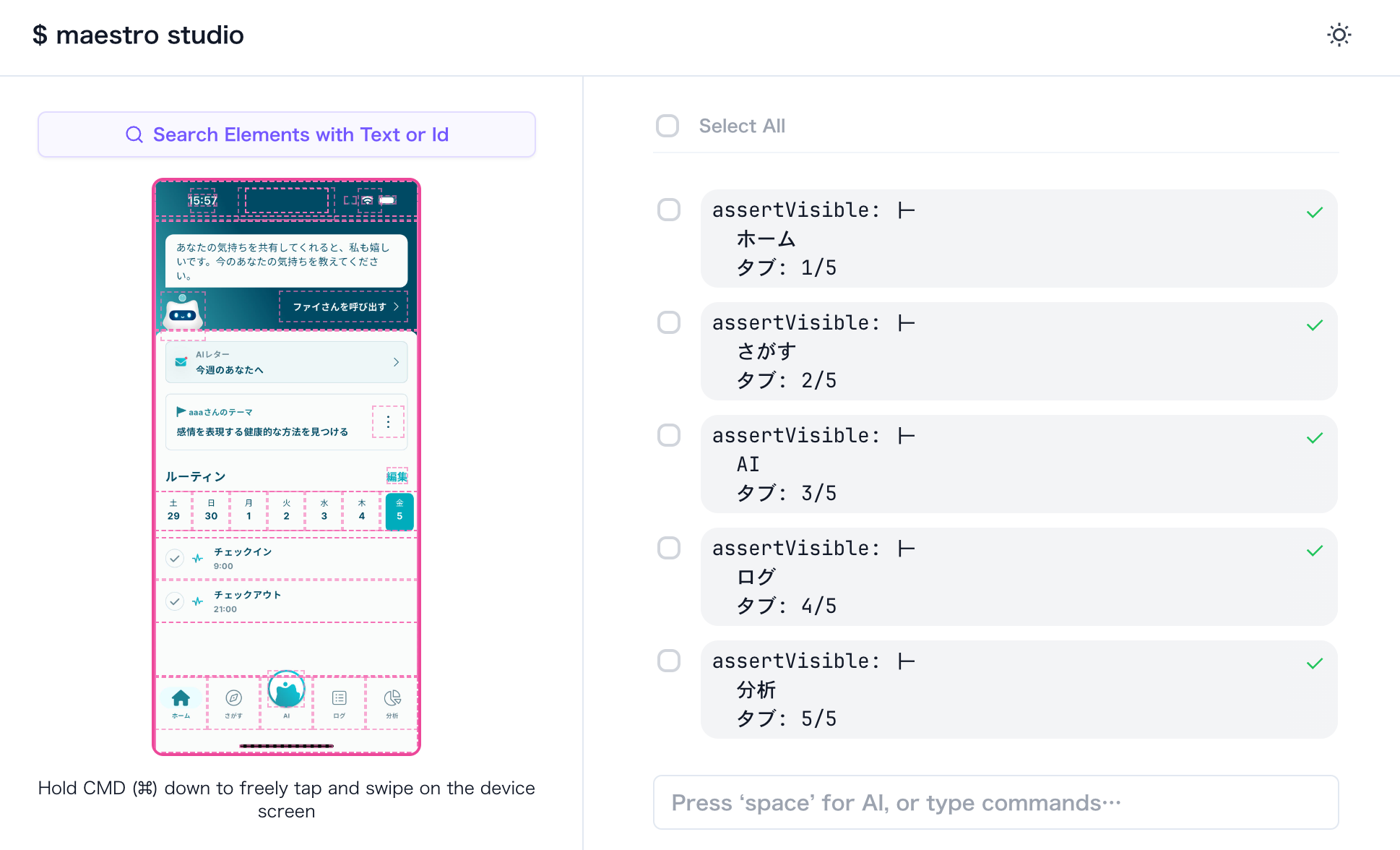 - assertVisible: 分析しかし、このテストケースではテストが失敗したため、Maestro Studioで確認すると以下のようになりました。