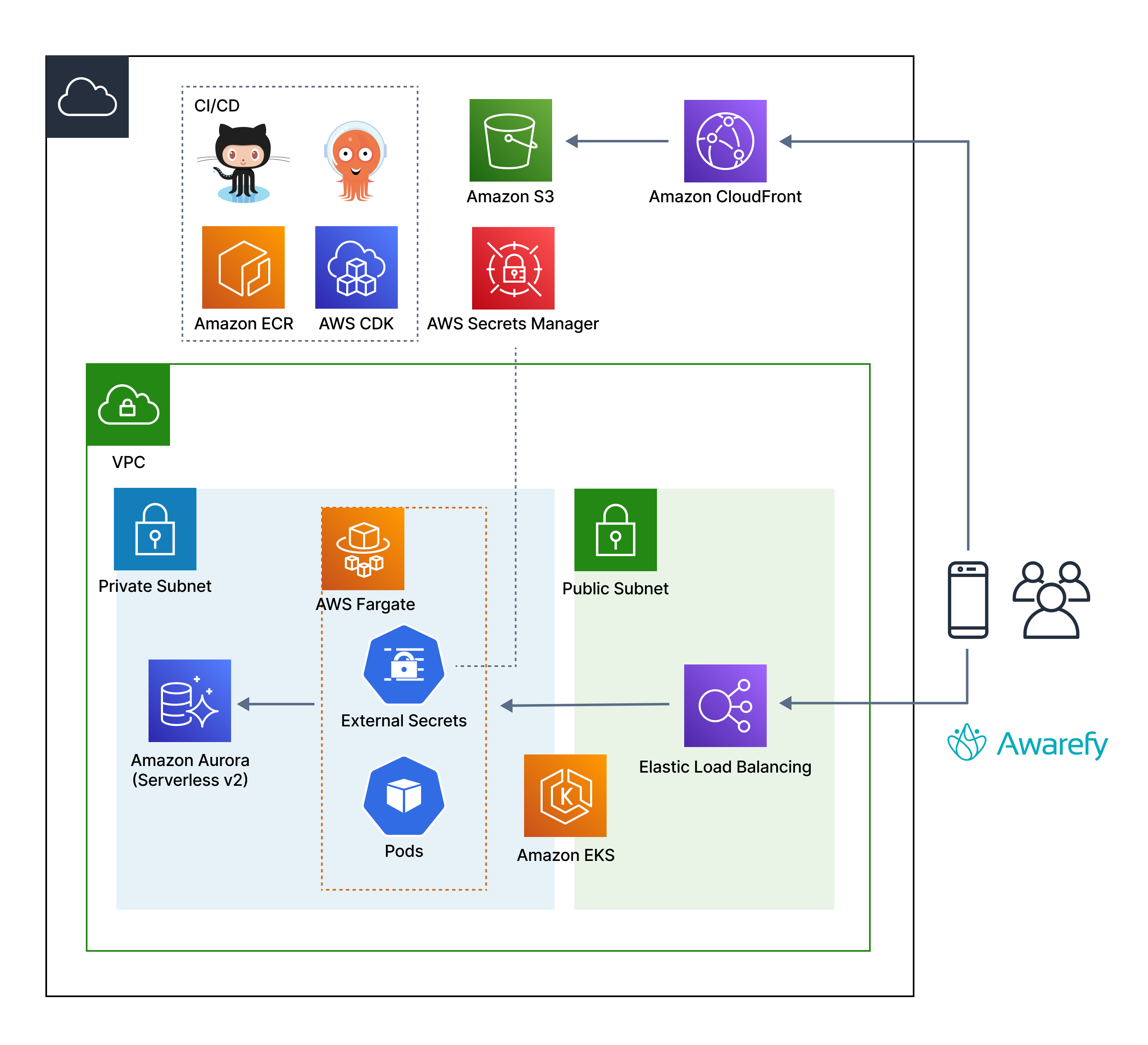 Awarefy は、2020年のリリース以後バックエンドシステムとして Firebase を採用していましたが、2022年中に AWS にインフラ移行を果たしました。そんなインフラ移行の経緯にも触れつつ、Amazon EKS や Amazon Aurora Serverless v2 を採用した AWS 活用事例を AWS Startup ブログ に取りあげていただきました。
