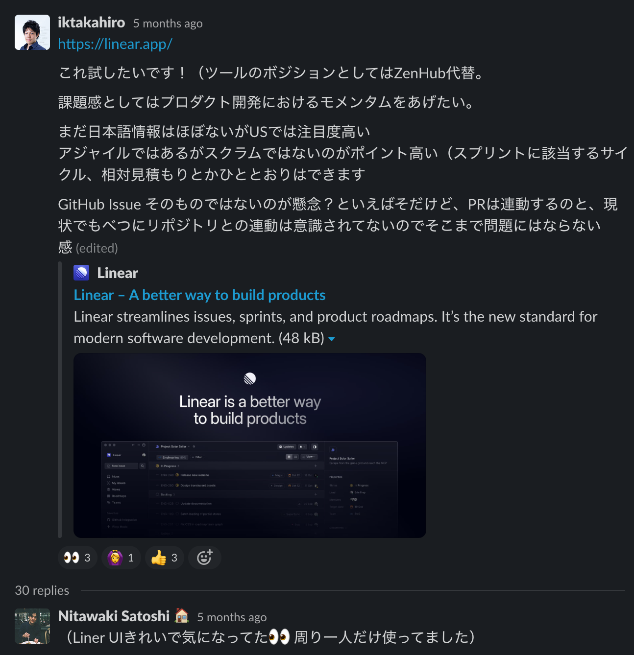 レンダリングの軽やかさ、複数人で操作したときのデータ同期の速さ、といった非機能領域の使用感の高さと、機能についてもミニマルながら痒いところに手が届く、という絶妙な取捨選択の妙がそうさせている、という具体はいくらでもあげられるのですが、それを下支えしているであろう Linear Methodと、フロントエンド実装の技術力(デザイン含む)の高さが垣間見えるという点において、他のツールとはまったく違うポジションに位置していると感じます。頭角を現し始めた頃の Slack や Notion のような、というと伝わるでしょうか。少なくない既存製品があったが、引き込まれる魅力がある。Linear もそのようなプロダクトのひとつなのではないかなと思っています。